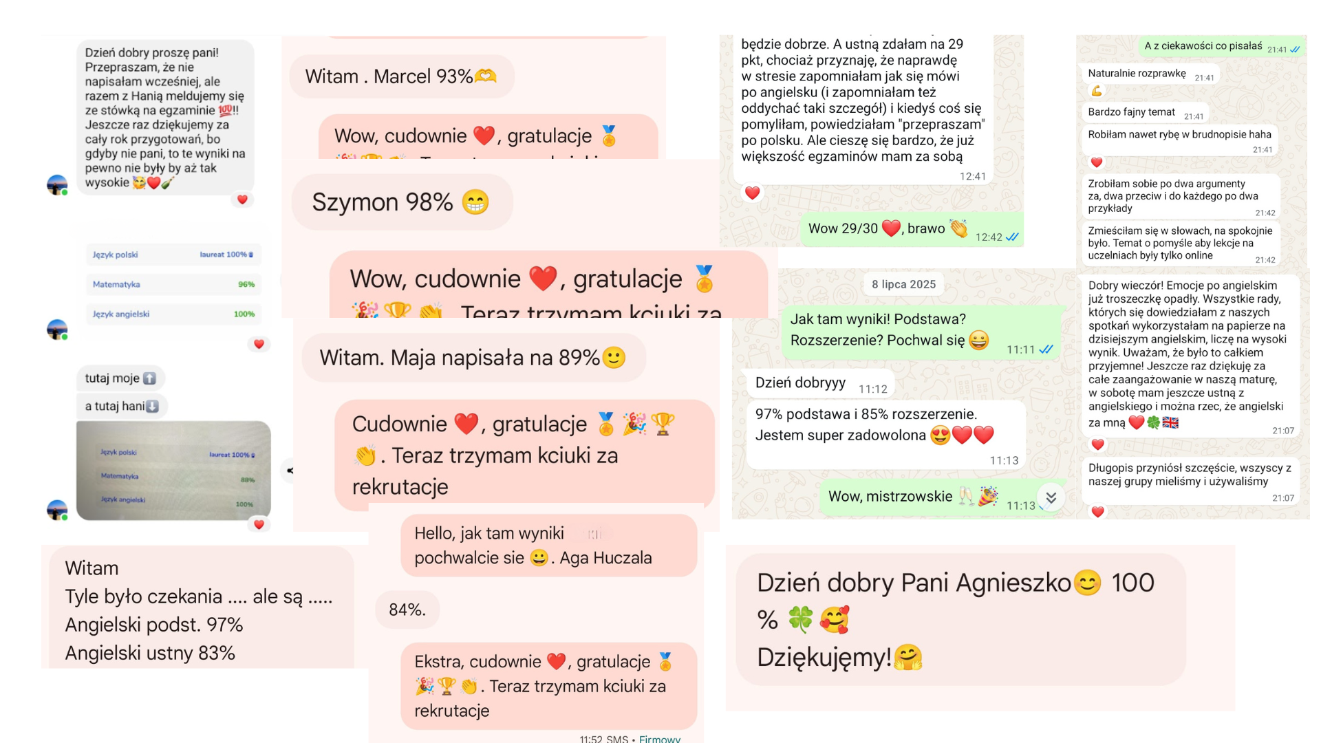 Przez ponad 20 lat pomagłam już ponad 500 licealistom zdać egzaminy na minimum 85% i mówić po angielsku swobodnie – bez paniki nad arkuszem i bez poczucia, że „musisz wkuć wszystko”.